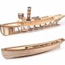 В наборе, кроме деревянных деталей, вы найдёте множество металлических элементов. Это и кнехты, и якоря, и шпили, и лебедки, и воздухозаборники, и прожектора, и иллюминаторы, и всевозможные стойки. А обе шлюпки буксира выполняются из дерева по наборному каркасу. Сразу же в комплекте с моделью вы получите гребной винт, руль, дейдвуд и качалку для рулевой машинки (потребуется при установке радиоуправления). В сборке этой модели буксира вам будет помогать пошаговая цветная фотоинструкция, где содержится много цветных фотографий от закладки киля модели до установки аппаратуры управления.